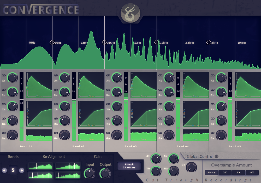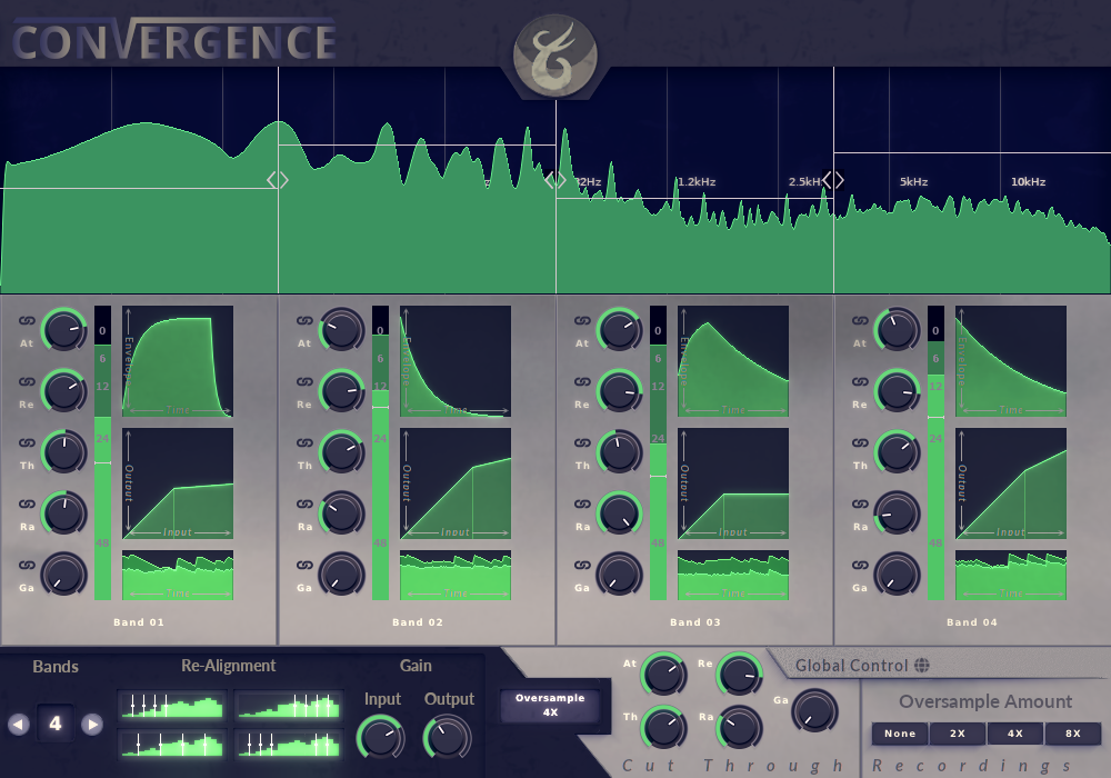 Convergence was created with one goal: To be the best multiband compressor plugin in your arsenal. This one of a kind compressor features 10 bands of finely-tuned compression. The bands can be added and removed as needed, allowing for as few as 2 bands and as many as 10. Each compressor has the standard controls you would expect: Attack, Release, Threshold, Ratio, and Gain. Along with these controls, Convergence features 3 displays per band that show the envelope of the attack and release settings, the relationship of the ratio to the output, and lastly a historical waveform showing the output compared to the input.