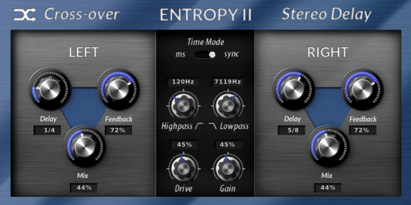Entropy II, like it's predecessor, is a stereo crossover delay but with several features that will help take your recordings to the next level! Entropy II comes with many new features that will allow you to truly express your creative vision. Choose between milliseconds delay mode when you want to dial in a precise amount of delay, or tempo sync mode when you need your track to take on a completely different form. Entropy's unique delay algorithm is bound to make your tracks bounce with ambience and excitement.