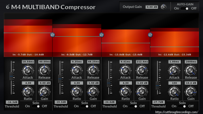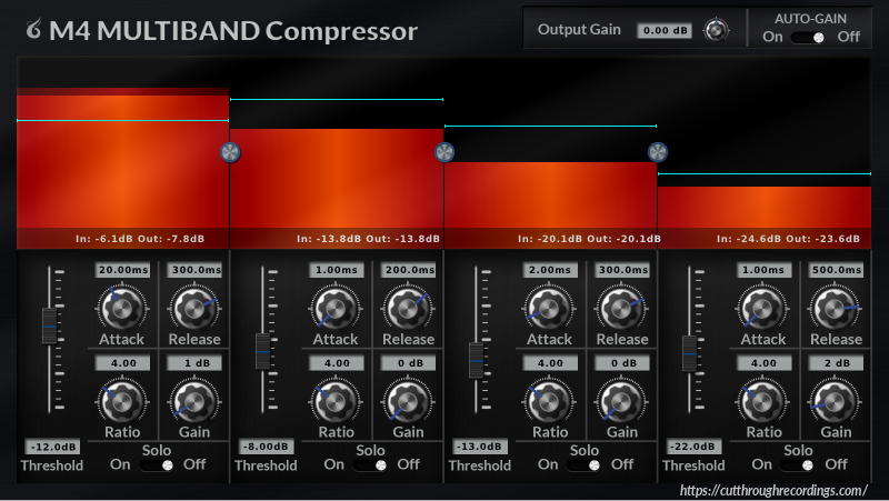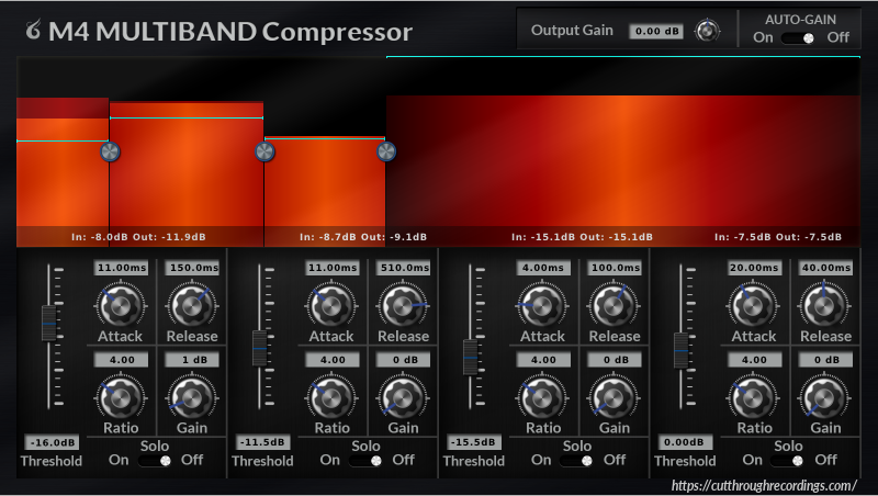 M4 Multiband Compressor is designed to be the ultimate mixing and mastering tool. This compressor has 3 user-controlled crossovers resulting in 4 bands that can be as wide or as narrow as you desire. The unique display for M4 shows all of 4 bands together, each with a specialty meter to show threshold, peak level, and gain reduction for the respective band in realtime. All 4 bands are completely in your control by allowing attack time, release time, threshold, ratio, and makeup gain to be set. M4 also has optional auto-makeup gain as well as internal bypass.
